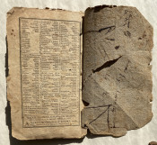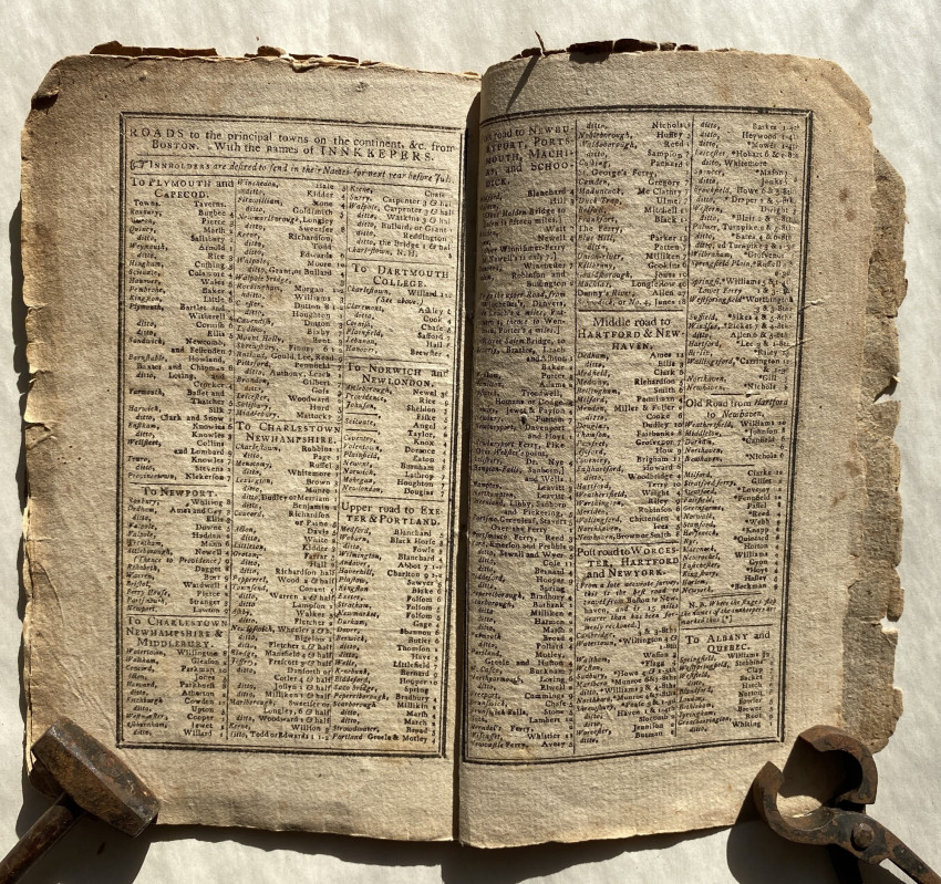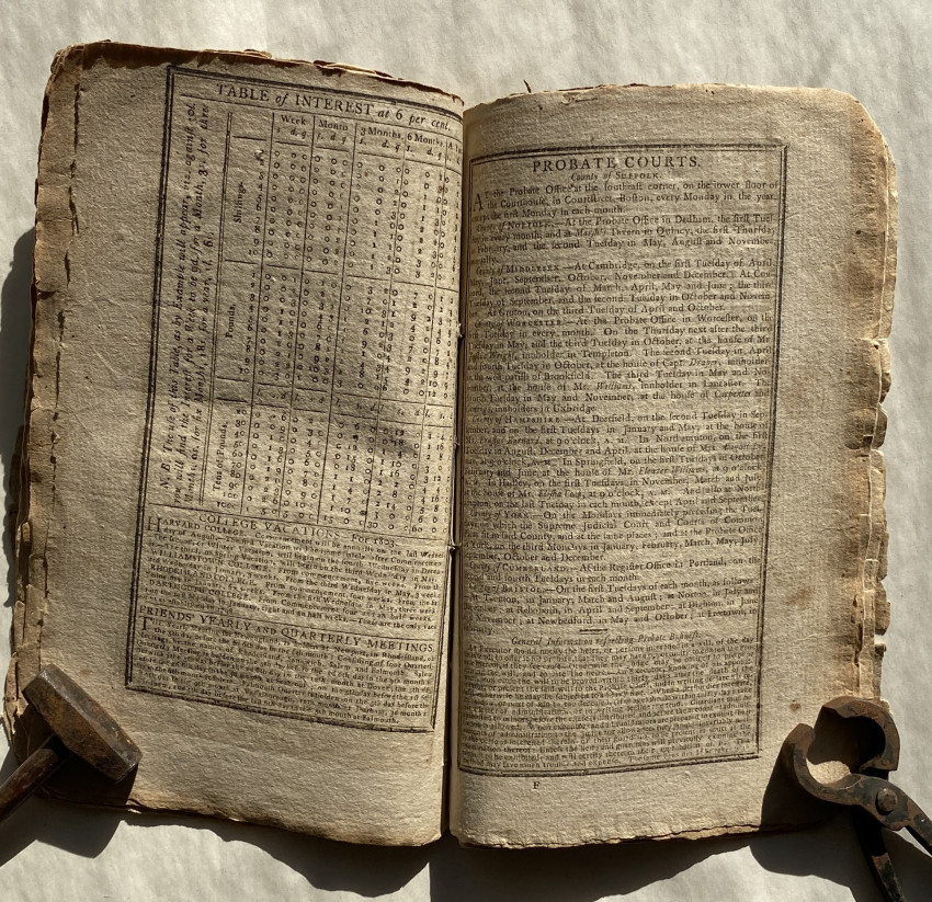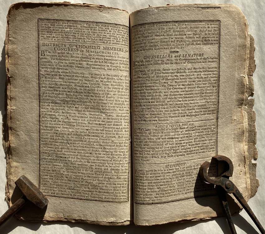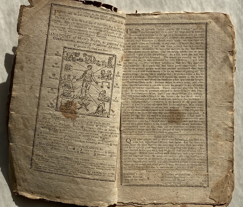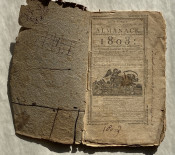 Isaiah Thomas's Massachusetts, Connecticut, Rhode-Island, New-Hampshire and Vermont Almanack, With an Ephemeris, for the Year of Our Lord 1803. Worcester, Mass.: printed … by Isaiah Thomas, jun. Sold by him at his Printing Offfice, and by I. Thomas, in Worcester, [etc.], [1802]. First edition. Twelvemo, bound 4s and 2s ([A]4-B2-C4-D2-E4-F2-G4-H2], 48 pages. Uncut (measures approximately 7 ¾ x 5in; 197 x 127mm). Various woodcut vignette illustrations, some marginal notes in a single contemporary hand . (Toned, clean 3-inch tear to leaf B1 [see images]).