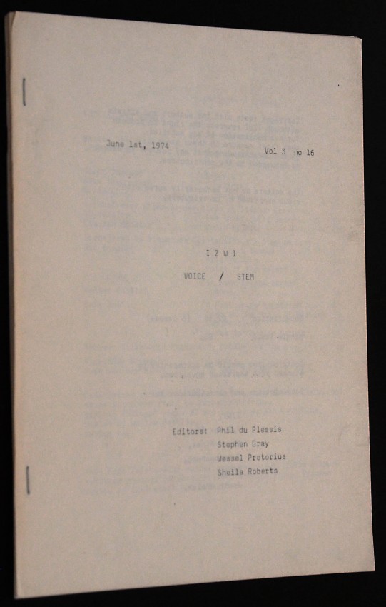 It must be noted that some of the signed works, called "graphics", are prints and not original graphics. Several, however, are original graphic works and many of the covers are also original graphics. The Peter Clarke graphic, for example, is an original silkscreen. There are a multitude of literary contributions by the likes of Peter Wilhelm, Wilma Stockenstrom, Sydney Sepamla, Sheila Roberts, Stephen Gray, Christopher Hope and many others too numerous to mention.