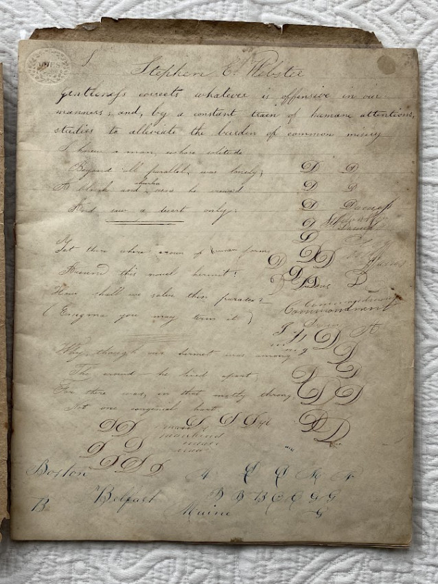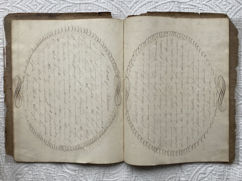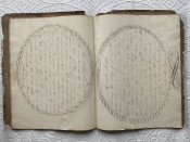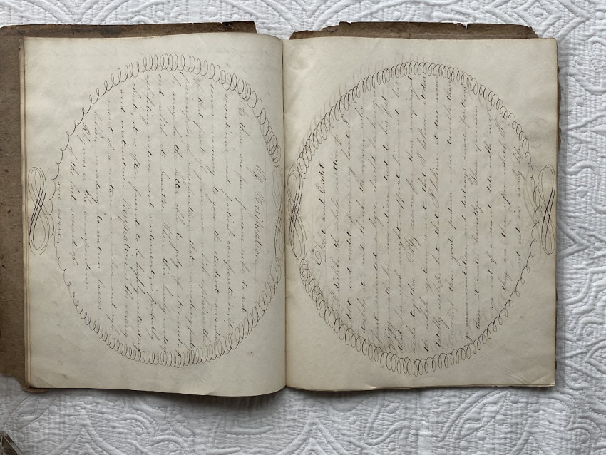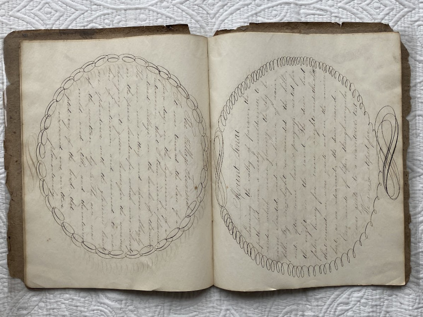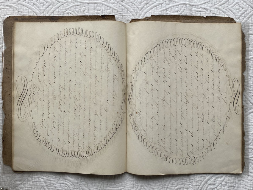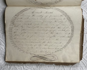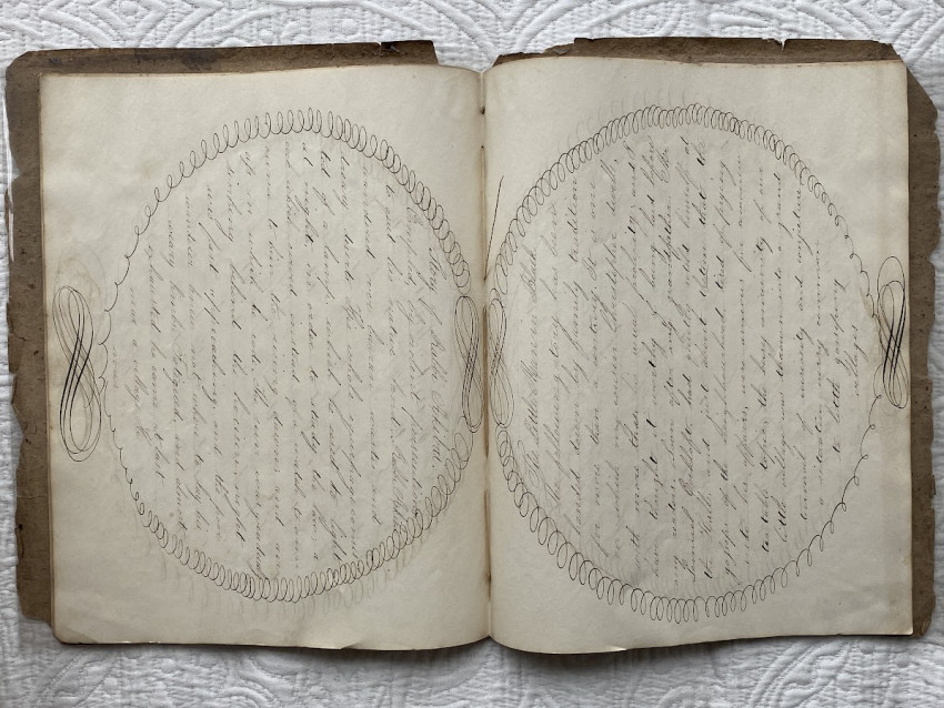 [John PIERPONT, Washington IRVING, Joseph ADDISON and others.] - Stephen E. WEBSTER, of Belfast, New Hampshire (scribe). [New Hampshire Manuscript copy-book]. [circa 1830s?], quarto (9 5/8 x 7 ¾ inches; 244 x 197mm). 44 pages, including ten pages with a large full-page calligraphic pen-work oval, each oval including all or part of an essay, each under a different heading: ‘Of Versification’; ‘Debt and Credit’(31); ‘On Lying’(20); ‘The Rose’; ‘The Village Funeral’; ‘Mount Sinai’(98); ‘Story of Rabbi Akibai’ (102); ‘The Little Man in Black’(75) ; ‘Portrait of a Patriarch’(21); ‘Discoverer of America’. Stitched between drab brown wrappers, with the ‘scribe’s’ name on the upper cover (split, chipped and detached).