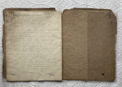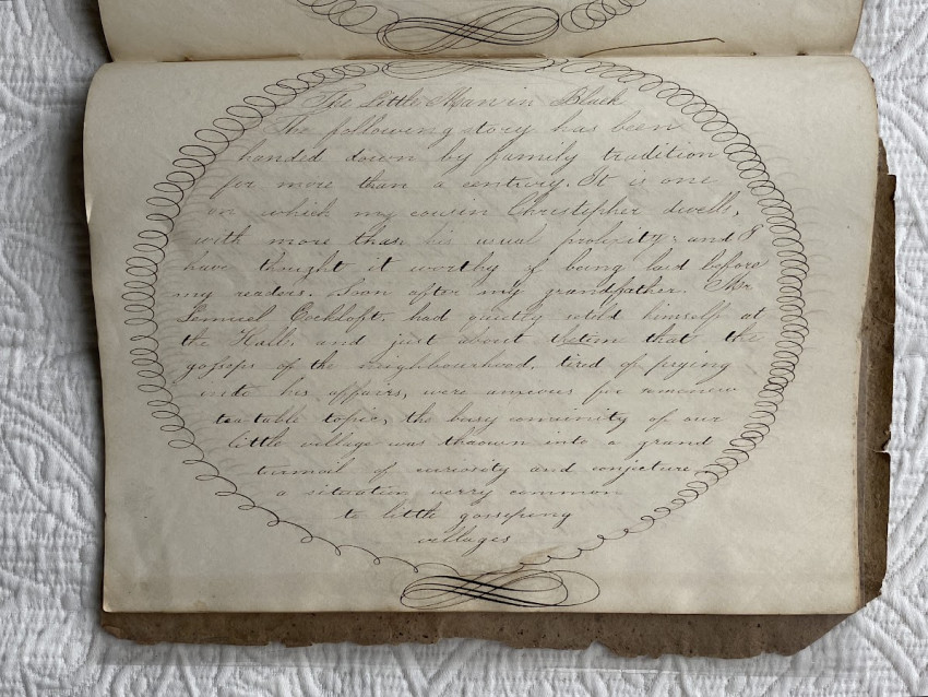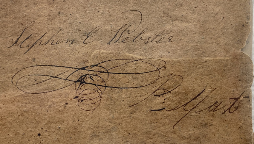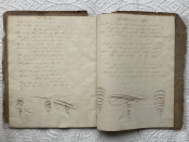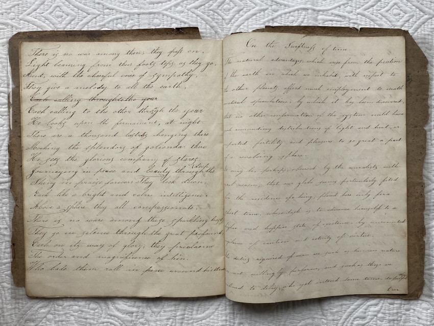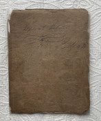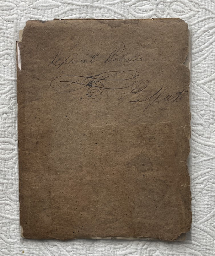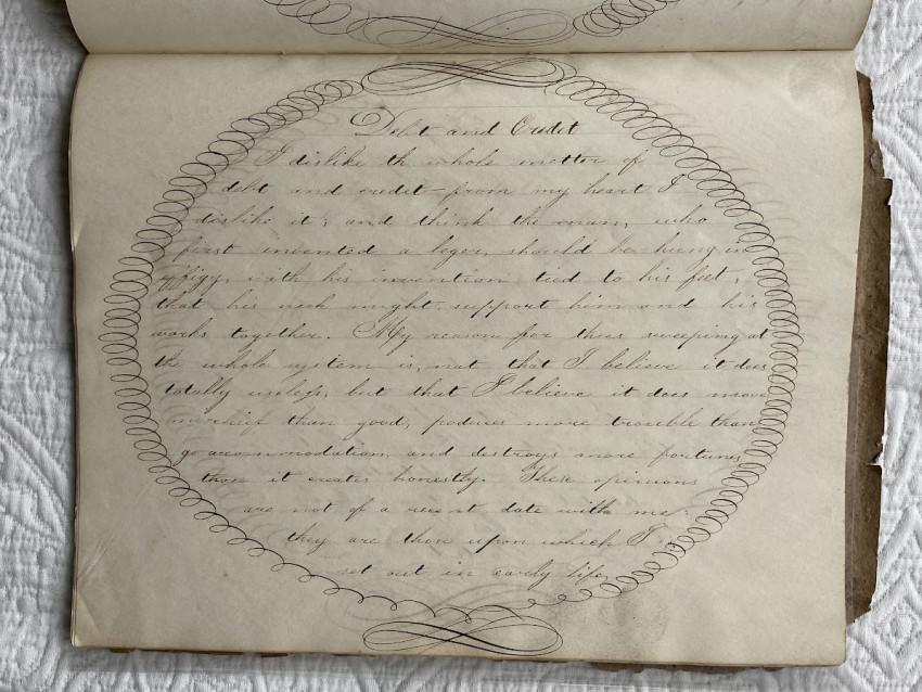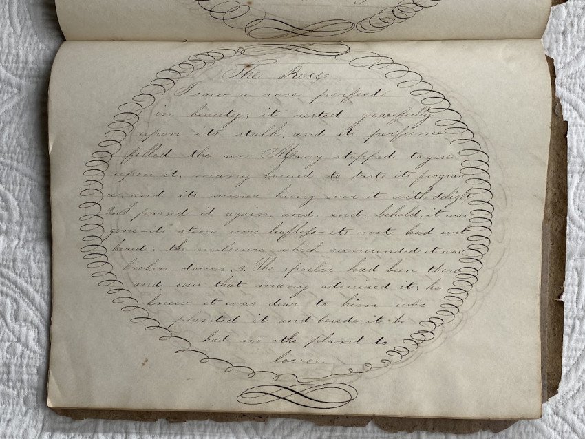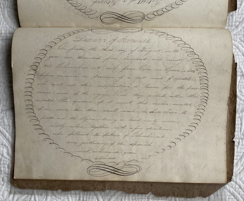 [John PIERPONT, Washington IRVING, Joseph ADDISON and others.] - Stephen E. WEBSTER, of Belfast, New Hampshire (scribe). [New Hampshire Manuscript copy-book]. [circa 1830s?], quarto (9 5/8 x 7 ¾ inches; 244 x 197mm). 44 pages, including ten pages with a large full-page calligraphic pen-work oval, each oval including all or part of an essay, each under a different heading: ‘Of Versification’; ‘Debt and Credit’(31); ‘On Lying’(20); ‘The Rose’; ‘The Village Funeral’; ‘Mount Sinai’(98); ‘Story of Rabbi Akibai’ (102); ‘The Little Man in Black’(75) ; ‘Portrait of a Patriarch’(21); ‘Discoverer of America’. Stitched between drab brown wrappers, with the ‘scribe’s’ name on the upper cover (split, chipped and detached).