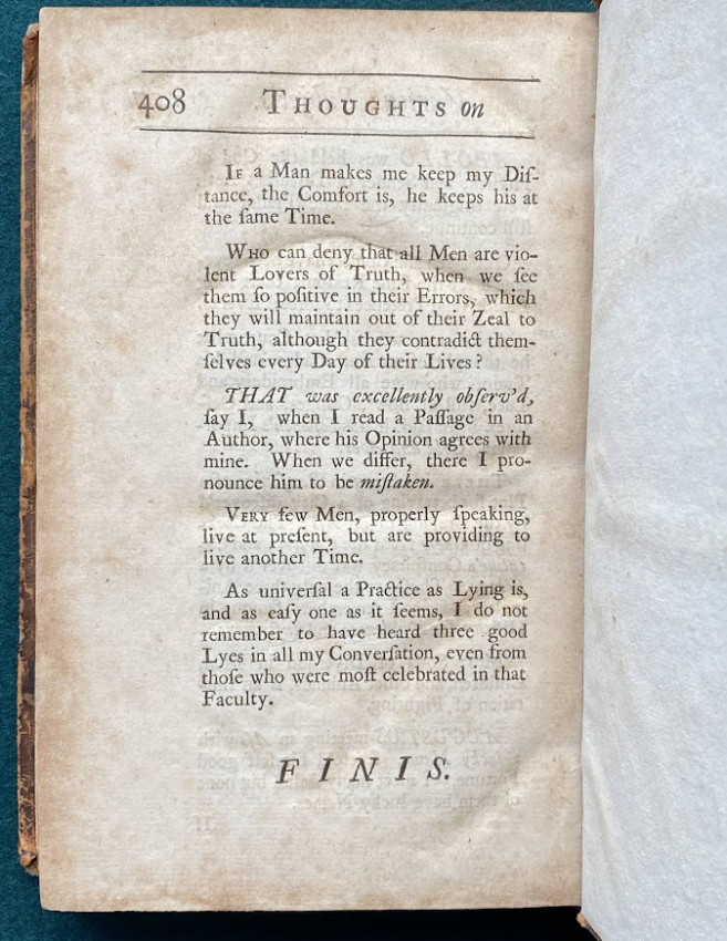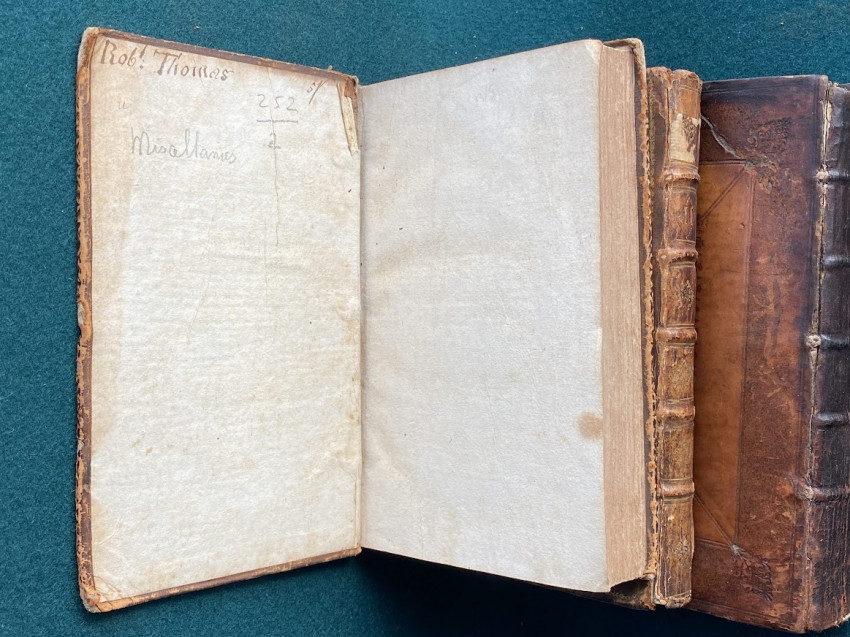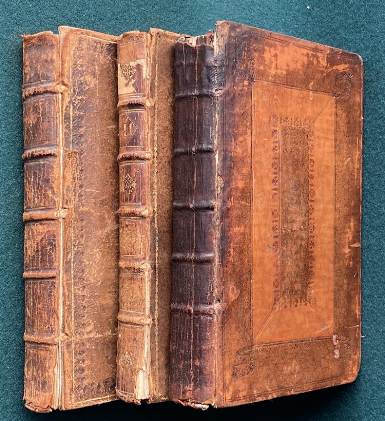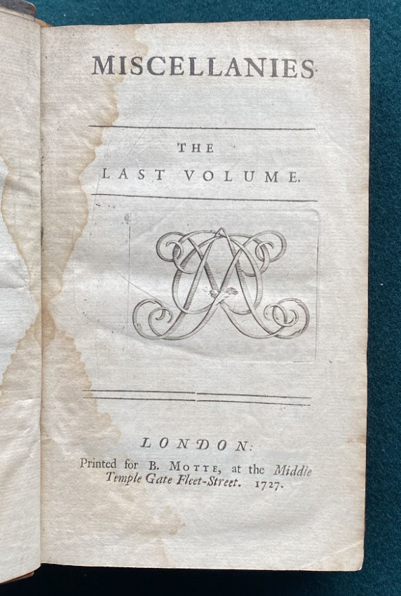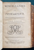 [Jonathan SWIFT (1667-1745), Alexander POPE and others]. Miscellanies in Prose and Verse. The First Volume. [Miscellanies. The Second Volume; Miscellanies. The Last Volume]. London: printed for Benjamin Motte, 1727-1727-1727. 3 volumes, octavo (7 5/8 x 4 5/8 inches; 193 x 118 mm). Vol.I with p.269 numbered as '296' (as issued), Vol.II with 1p. publisher’s advertisements facing the title, and P3 a cancel. (Light toning to vol.I, old dampstaining to vols. II and III). Contemporary non-uniform calf, variously tooled in blind, or gilt and blind (extremities worn). Provenance: Robt. Thomas (signature in vol.I); E. Arnold (possibly Edwin Arnold [?], signature in vol.III).