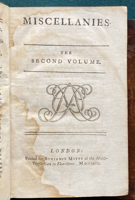 First editions of all three volumes, but a ‘harlequin set. Intended as a foil to the publishing pirates and literary fakers who were targeting Swift and Pope. The pair laid out their stall in the preface to the first volume: 'The Papers that compose the first of these Volumes were printed about sixteen years ago, to which there are now added two or three small Tracts; and the Verses are transferred into a Volume apart. The second (and perhaps a third) will consist like this, of several small Treatises in Prose, wherein a friend or two are concerned. Having both of us been extremely ill-treated by some Booksellers, (especially one Edmund Curll,) it was our Opinion that the best Method we could take for justifying ourselves, would be to publish whatever loose Papers in Prose and Verse, we have formerly written' (Preface to vol.I, dated 27 May 1727). Teerink-Scouten 25 (1a); (2b) (P3 is a cancel and the initial leaf of advertisements is present); (3c).
