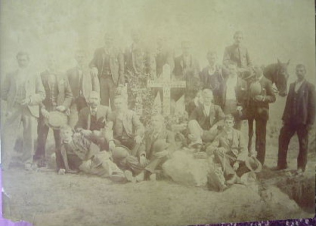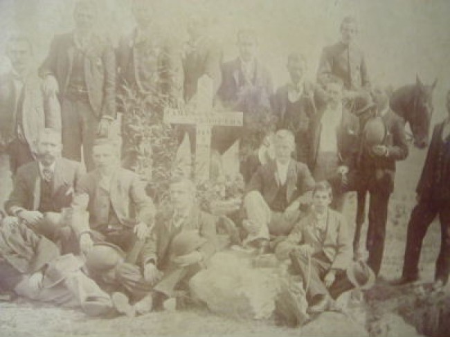 A single, original large sepia photograph (29 x 23 cm) showing eighteen young men, standing, reclining (and one on a horse) around a cross. Printed on the cross \"Jameson\'s Troopers, Jan 2, 1896.\" The people have not been identified but are quite clear. The photo has faded slightly and has some damage to one corner but is otherwise good