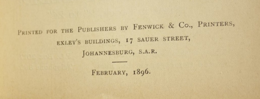 An extremely scarce booklet printed for the publishers in February, 1896, by Fenwick & Co., Exley's Buildings, 17 Sauer Street in Johannesburg S.A.R. (South African Republic).