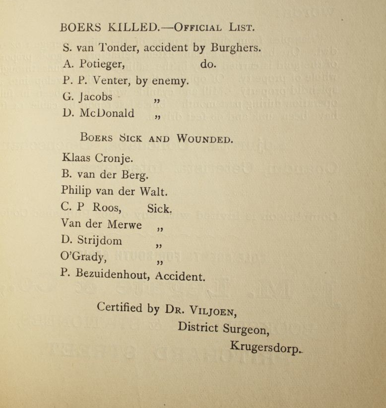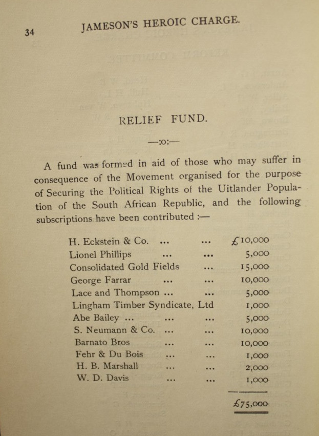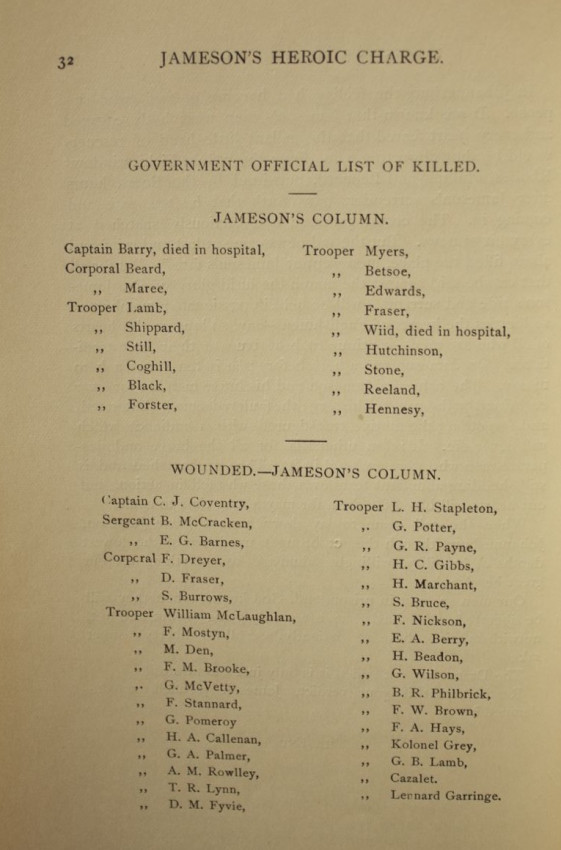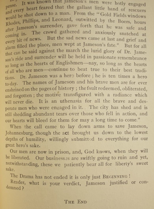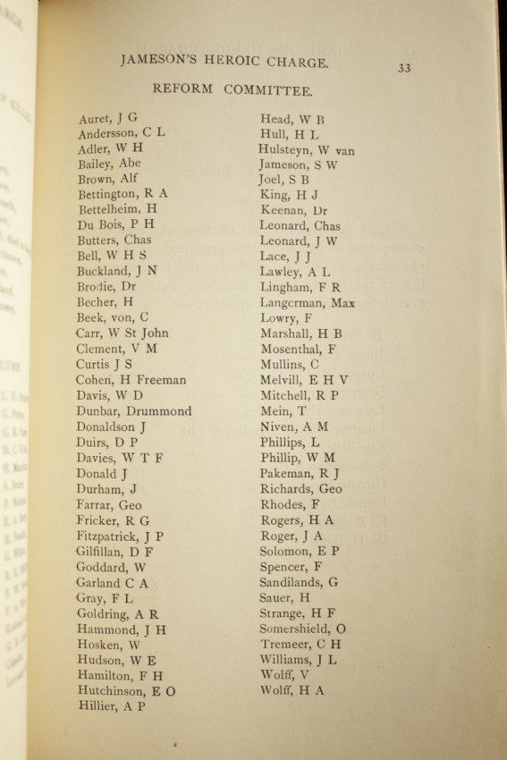 'A brochure written as a counterblast to the pamphlet "The Revolution-and After." There is a summary of the charges against the Boers and their government, and it is stated that, "when the National Union gave up all hope, the Capitalists stepped in." The allegations in "The Revolution-and After" are denied in violent language, and it is asserted that a false letter, and an equally false telegram, were sent to Jameson, and that the Reform Committee were dumbfounded on receipt of the news that he had crossed the border. The author of Part II. purports "to give a true and impartial history of Jameson's ride, as furnished by one who was in it from start to finish," and full details are given of the Raid and the subsequent surrender. There is a government official list of the killed and wounded in Jameson's column; also the names of the Reform Committee, and the amounts subscribed by different firms and persons under the name of the Relief Fund, a list of "The Charter(ed) Prisoners," and the official account of the Boers killed and wounded.' See Mendelssohn, Vol.I. page 768.