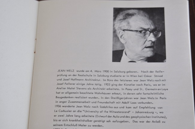 Exhibition catalogue from 1965, from an exhibition held at Jean Welz's brother's gallery in Salzburg. Very good, clean condition. Catalogue introduction comprises a re-print of a letter Welz wrote to his brother explaining that his paintings were “documents of his soul” and that his objective was to create “painterly poems”. A5 in size, card covers, 16 pages, numerous b/w plates. Paintings 29 to 46 are catalogued on a loose sheet as they were added after the initial catalogue was printed. All text in German.