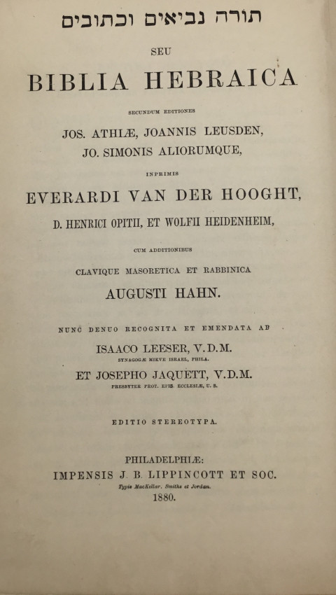 Bible. Old Testament. Hebrew. 1880.; Seu, Biblia Hebraica; Biblia Hebraica; Bible.; Old Testament.; Hebrew.; 1880. Responsibility: editiones Jos. Athiae, Joannis Leusden, Jo. Simonis aliorumque imprimis Everhardi van der Hoogt, D. Henrici Opitii et Wolfii Heidenheim, cum additionibus clavique Masoretica et Rabbinica Augusti Hahn, nunc denuo recognita et emendata ab Isaaco Leeser et Josepho Jaquett.
