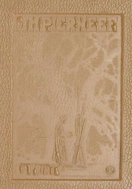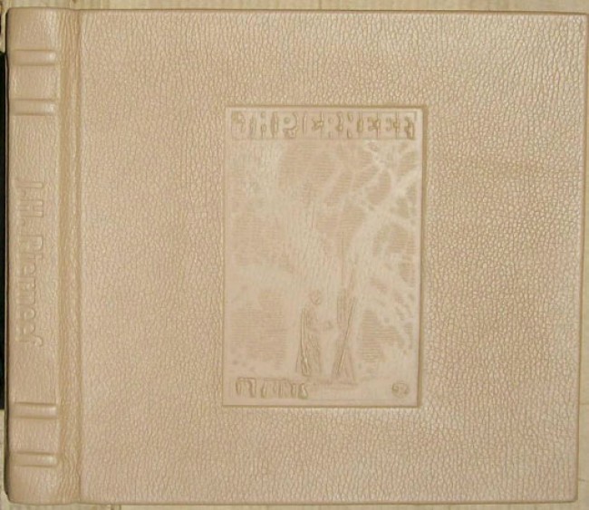 Bound in full light brown leather that has the title blind stamped on the spine and a Pierneef design blind stamped on the upper board.