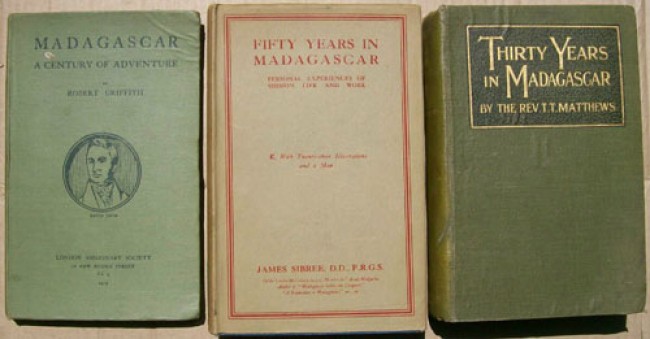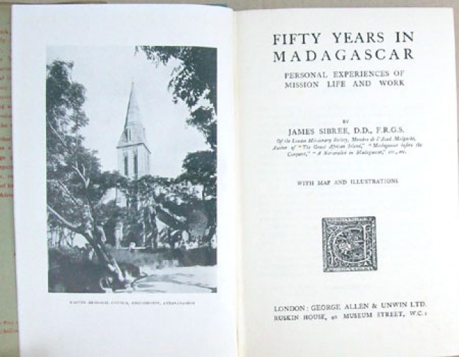 2): Sibree, James: \"Fifty Years in Madagascar - Personal Experiences of Mission life and Work.\" Original dust jacket. Original blue cloth boards with black titling on the spine and the upper board. 359 pages, 23 black and white photographic plates and a map. First edition published by George Allen, & Unwin Ltd, London, 1924. The spine of the dust jacket is faded and there is a pen name on the free front end paper, but still an above average copy.