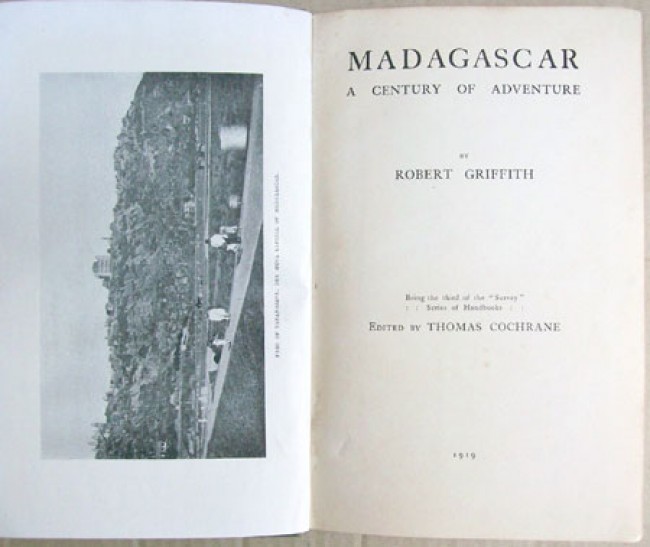 1):Griffith, Robert: \"Madagascar - A Century of Adventure.\" Original green cloth boards with black titling on the spine and the upper board, with a pictorial device. 79 pages, 2 black and white photographic plates, 5 fold out coloured maps and one black and white map. First edition published by the London Missionary Society, London, in 1919 as the third title in their \"Survey\" series. Internall clean, but the binding is a bit worn and soiled.