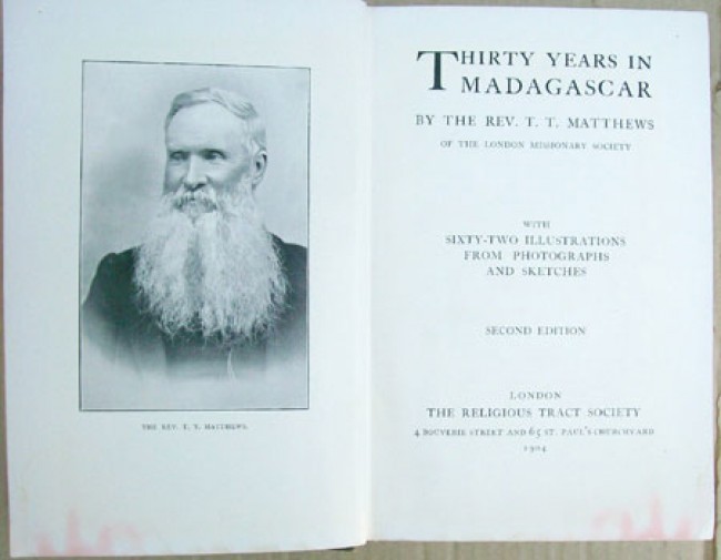 3): Matthews, The Rev. T.T.: \"Thirty Years in Madagascar.\" Original green cloth binding with gilt titling on the spine and the upper board, which has a title panel. 384 pages, 62 black and white photographic plates, map of Madagascar. Second edition published by the Religious Tract Society, London, 1904. The binding is a bit worn and the title page and frontis have a stain on the bottom edge. Pen name on front paste down.
