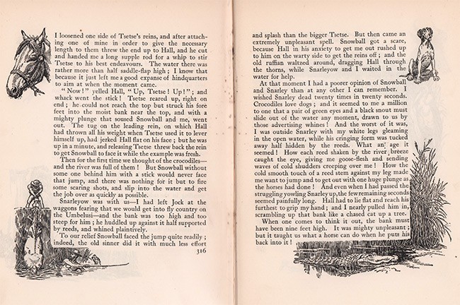 With the drawings of a dung beetle pushing his load with his front legs rather than his back legs on pages 65, 337 and 457 and snowball the horse being dragged out of the river on page 316. These drawings were changed in later impressions.