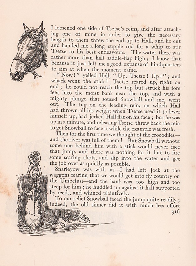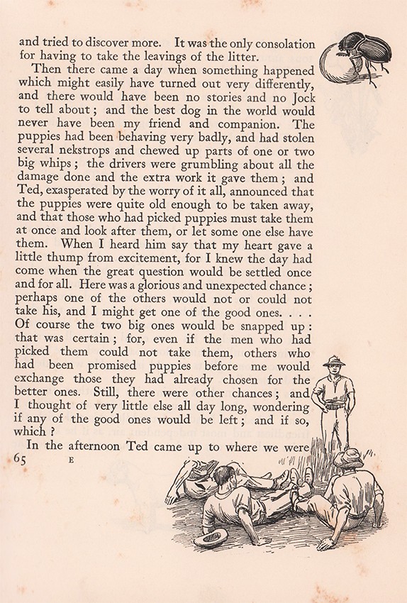First edition First impression. 475 pages, colour frontispiece, plates and marginal illustrations, dark green cloth with gilt titling and gilt vignette of Jock on the upper cover, with the drawings of a dung beetle pushing his load with his front legs rather than his back legs on pages 65, 337 and 457 and Snowball the horse being dragged out of the river on page 316 - these drawings were changed in later impressions, slightly frayed at the top and bottom of the spine, a very good copy.