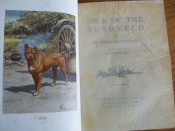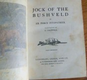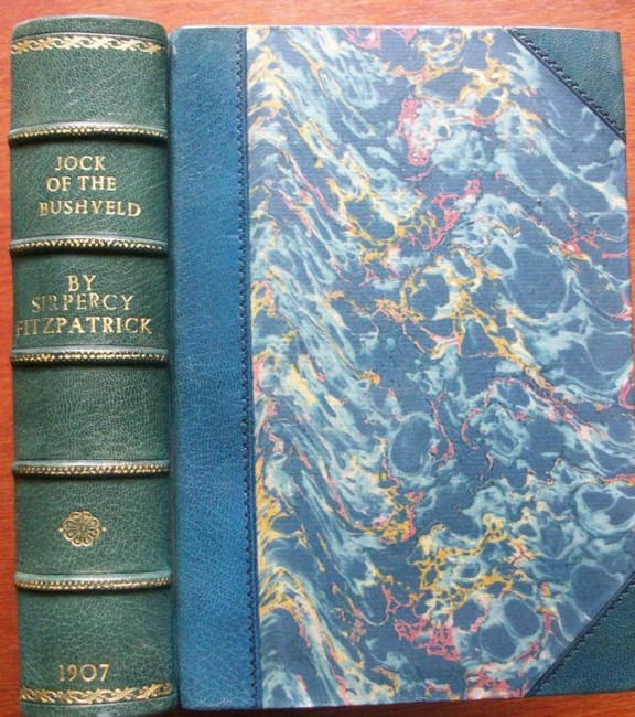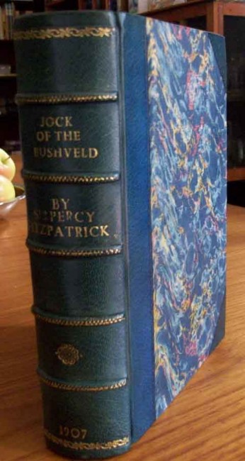 Jock of the Bushveld by Sir Percy Fitzpatrick. Illustrated by E. Caldwell, third impression 1907. 1/4 bound morocco leather with marbled cloth boards and marbled endpapers. 5 raised ribbed spine with gilt lettering and dated 1907. The binding is modern. Coloured frontispiece with tissue guard. Preface with 474 pages of text with plates and black and white line drawings to margins, odd spot, attractive copy.