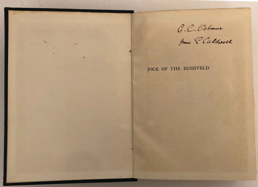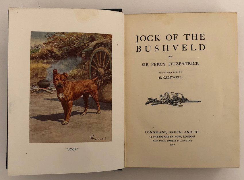 A very nice copy of the first edition first impression of this classic South African title, inscribed by the illustrator, Edmund Caldwell. In the original green cloth with gilt illustration of Jock on the front cover and gilt lettering and and illustration on the spine panel and front board. With all the requisite issue points and no indication of later printing on the title page. Undated two line signed inscription by Caldwell on the half-title page.