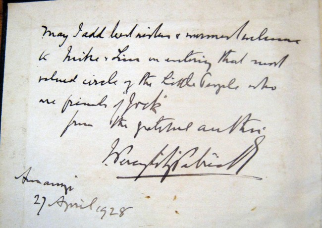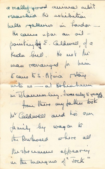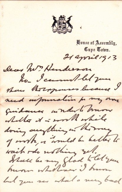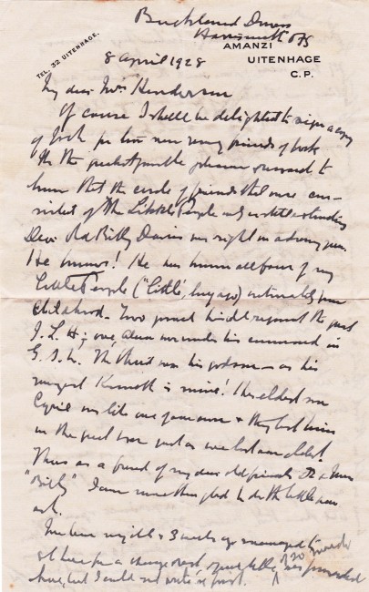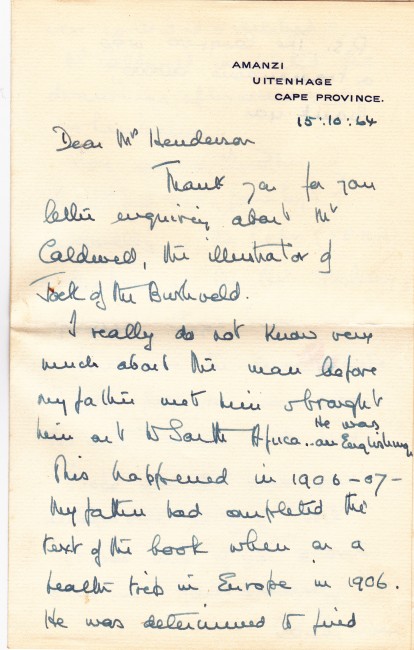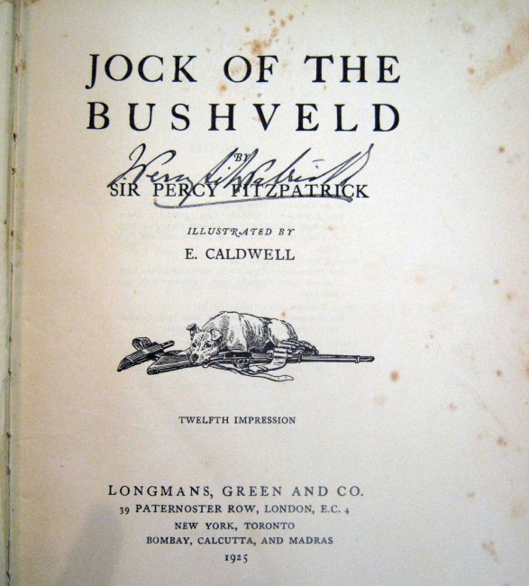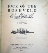 Inscribed and signed on front paste down endpaper by Percy Fitzpatrick, dated 1928 and on the title page. 475p. Illustrated. The book itself has some foxing. Enclosed are four letters in three original envelopes. The first is a letter dated 1913 using House of Assembly letterhead from Percy Fitzpatrick to Mrs Henderson, handwritten and signed by Fitzpatrick. The second envelope contains two letters, one dated 26 April 1928 is to Mrs Henderson of Natal and makes reference to his children who passed away \"all three boys are gone\". This letter is typed with his signature at the bottom from Uitenhage. The second letter in this envelope is dated 8 April 1928, is handwritten and refers to Fitzpatrick signing a copy of Jock for Mrs Henderson. The fourth letter is handwritten and dated 1964 from the daughter (Cecily) responding to questions about the illustrator, Caldwell.