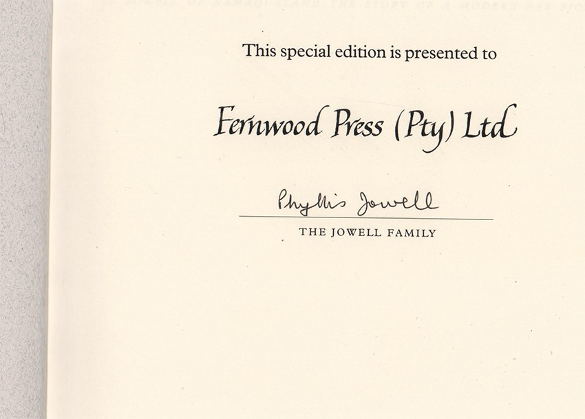 This special edition is is presented to Fernwood Press and signed by Phyllis Jowell on behalf of the Jowell Family.