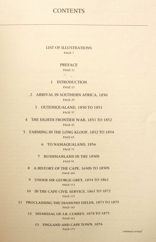 Soldiering, farming, copper-mining - Currey tried all these; then, on the advice of governor Sir George Grey he joined the Cape civil service. While in its employ in the late 1860's he was entrusted with the task of introducing to a sceptical Europe southern Africa's first diamond, the "Eureka". Later as secretary to the government of Griqualand West, he chose the new name of "Kimberley" for the burgeoning diamond-fields town of New Rush. But in 1875 Currey was blamed for the diggers' rebellion there, and this led to his dismissal from office and blighted his subsequently public career. While he was in Kimberley Currey befriended two young fortune-hunters, both of whom were to become renowned premiers of the Cape: Cecil John Rhodes and John X. Merriman. To both of them Currey was to remain a lifelong friend and counsellor.'