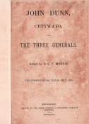 Mendelssohn (Sidney) South African Bibliography vol 1 pages 494-5. 'The history of John Dunn, the white Chief, is one of the most extraordinary narratives in South African annals. He started for the country in 1853, and traded and hunted till 1856, when the war of succession broke out between the two sons of Mpanda, i.e. Cetewayo and Umbulazi. Dunn joined the forces of the latter prince, who was defeated and slain, but he was afterwards reconciled to Cetywayo, and was successful in recovering the cattle of the white traders in Zululand. Some time after, the successful heir to the throne asked him to settle in Zululand, "as he wanted a white man as a friend to live near him and advise him," and after some consideration he accepted this offer. Panda dying in 1872, Cetewayo succeeded him, and there is a description of the scenes of his coronation, at which Mr Shepstone represented the English nation at the King's desire; amongst those present being Mr. Baines, the celebrated traveller.