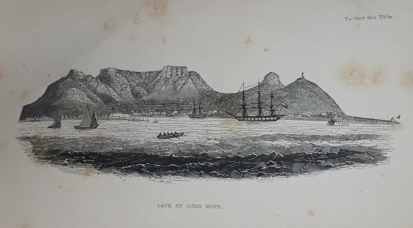 Rebound with gilt lettering on spine, new end papers, pp. 297, frontis of Cape of Good Hope, illustrated with 5 wood engravings. Published in 1848.