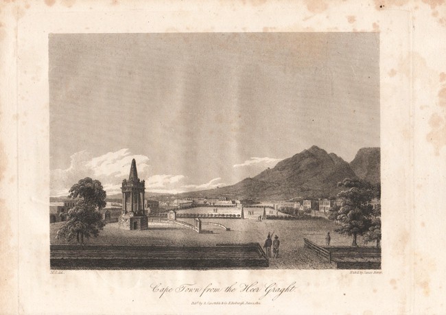 211 pages, hand coloured frontispiece, 16 engraved plates (including the Castle and the Parade in Cape Town) – 2 folding, contemporary green cloth with a red leather title label on the spine, light foxing and some browning throughout.