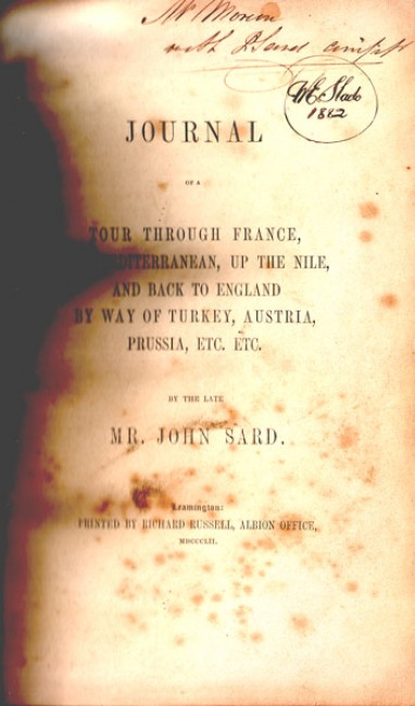 Mid-nineteenth century travelogue through the continent and towards Egypt and the Middle East - a typical grand tour.144 pp; in modern quarter calf re-bind with marbled boards. Slight foxing in prelims,a few pencil marginalia, otherwise very good condition. Presentation copy from the author, with inscr on tp and one other ownership.
