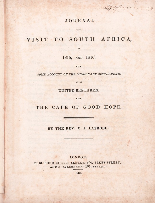 South Africa in Print, comments about Latrobe that 'He has left an important volume of travels with illustrations second only to those of Burchell'. Colvin in his introduction to Mendelssohn's South African Bibliography describes the Journals as 'written with much sweet piety and simplicity of spirit' yet (he) shows shrewdness of observation and a fine common sense.’