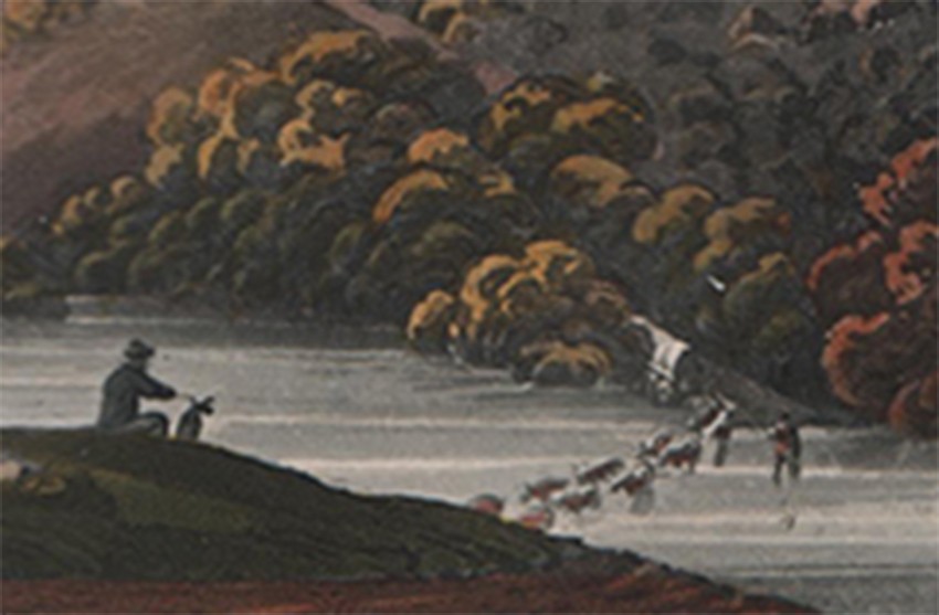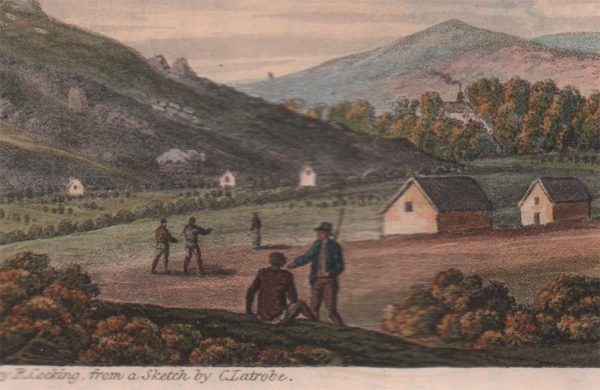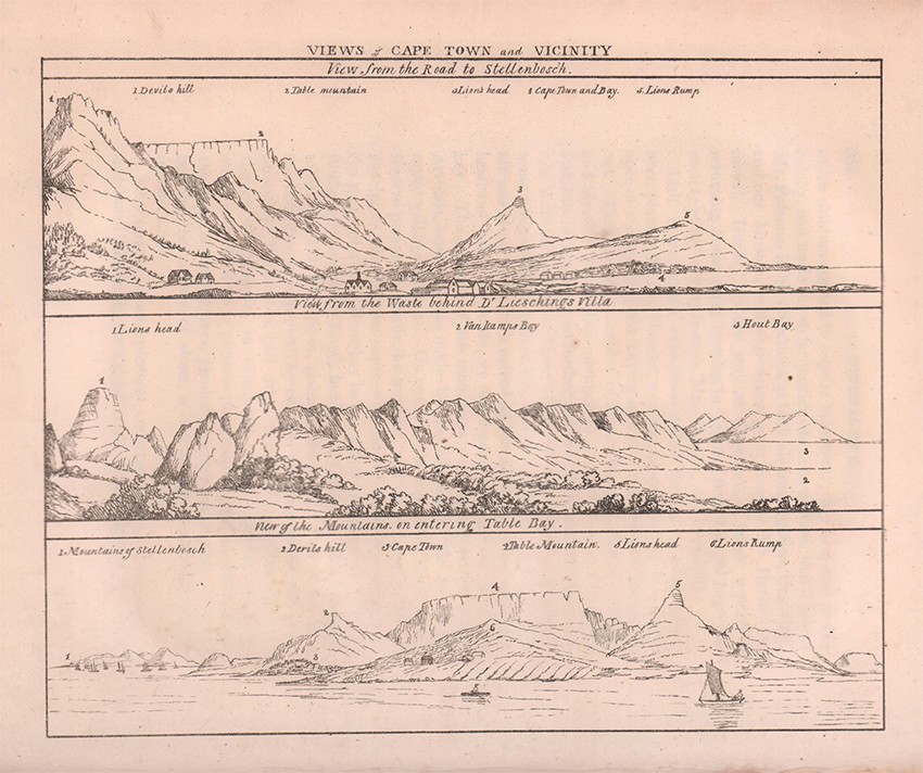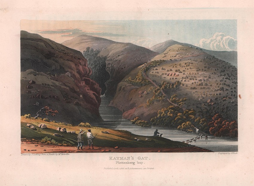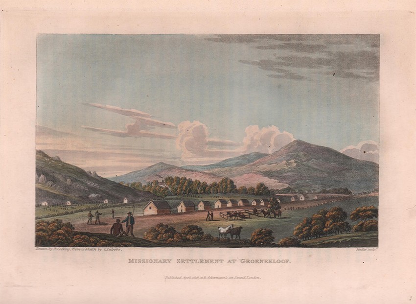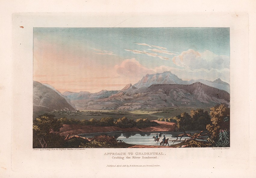 Bradlow (Frank R.) in his Biographical and General Introduction, to the facsimile reprint edition published by C. Struik in 1969 comments about the plates, ‘In view of the fact that all twelve of the coloured aquatint engravings, whether by Melville or Latrobe, would appear to have been redrawn by R. Cocking, it is of interest that the only merit Latrobe claims for the sketches is that they are 'scrupulously exact in outline'. This accuracy is almost certainly due to the fact that Latrobe used a portable camera obscura to capture the outlines. He twice refers to this camera obscura, once on page 73, when he relates how, when it was standing “in a position which showed the church and the grove, with people passing and repassing”, the Genadendal Hottentots were “exceedingly amused and astonished”. These twelve aquatints are in three tints, grey, black and brown, with hand water-colouring. They are extremely competent in composition, technique, and colouring, and in the writer's opinion, are superior to most illustrations in other contemporary books of South African travel.’
