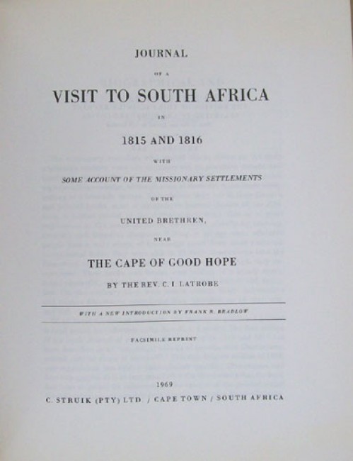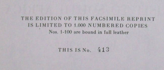 This is the C. Struik facsimile reprint of the 1818 L.B. Seeley edition and was published in 1969. The edition was limited to 1,000 copies, of which this is numer 413. It has a black and white frontis portrait, title page, a 44 page introduction by Frank R. Bradlow, followed by the facsimile with vii prelims, fold out map, 13 colour plates and a further 3 black and white illustrations.