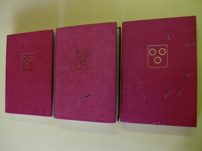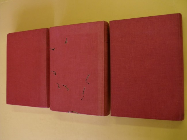 Three volume set in original red cloth boards. The very low reserve price is due to the covers of vols.2 and 3 being affected by worming (now extinct). Volume 1 is unaffected.The worming on vol.2 affects the front board and one of the holes extends through to about p.40. Vol.3 has one area of worming on the front board, and several areas on the rear, extending from the rear board to about p.388, and one hole from the front reaching in to about p.225. Despite this unfortunate damage, all contents are clean and legible, and the worming is now totally extinct, and the spines are very good, with no worming.