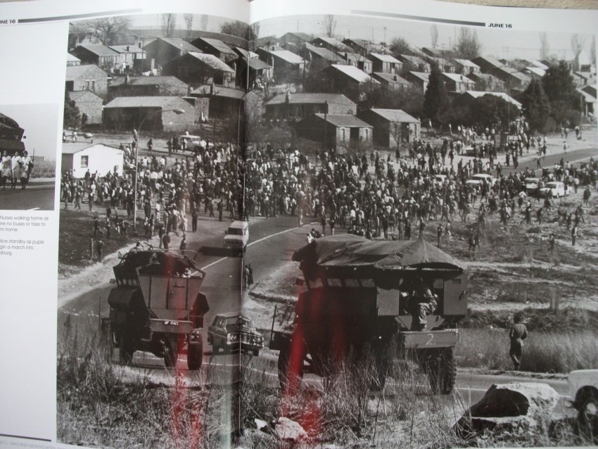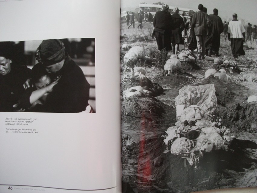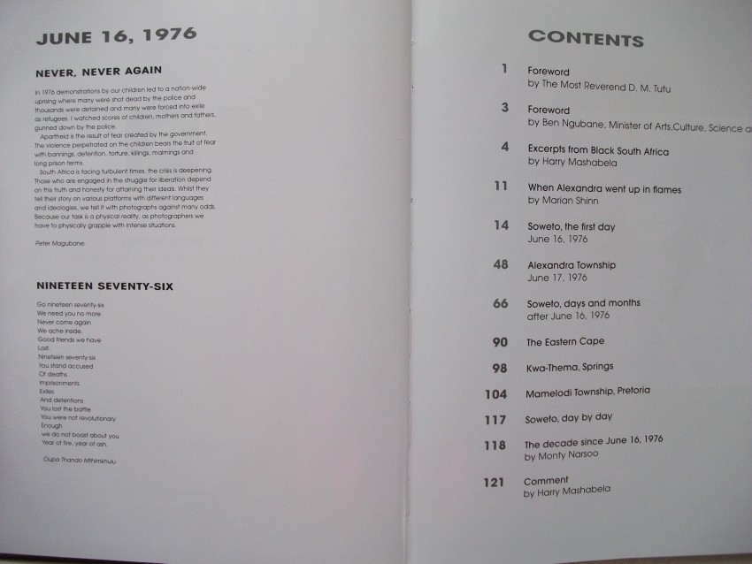 Photographic glazed boards, printed in black and red. Plain black endpapers. [viii] + 124 pp of b/w photographic illustrated text printed on gloss art paper. All the photographs are by Magubane, while the text contributions are by Desmond Tutu, Ben Ngubane, Harry Mashabela and Monty Narsoo.