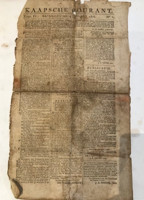 This is probably the last document issued under the Dutch who had controlled the Cape for the previous 154 years. It is full of requests from Governor Janssens for the populace to stand firm in the 'bescherming en verdeediging van het land hunner inwooning'. He was not to know how many men were assembled in the approaching fleet, but he tried to defend his post. The Drostdy of Stellenbosch was asked to supply 'drie-en-veertig Manschappen', Zwellendam 50, Graaff-Reynet 40, Uitenhage 25, Tulbagh 25 and so on. The Courant also records other instructions issued by Janssens to the Procureur Generaal, Beelarts van Blokland, Commandant der Troupes, P.L. Henry and others.