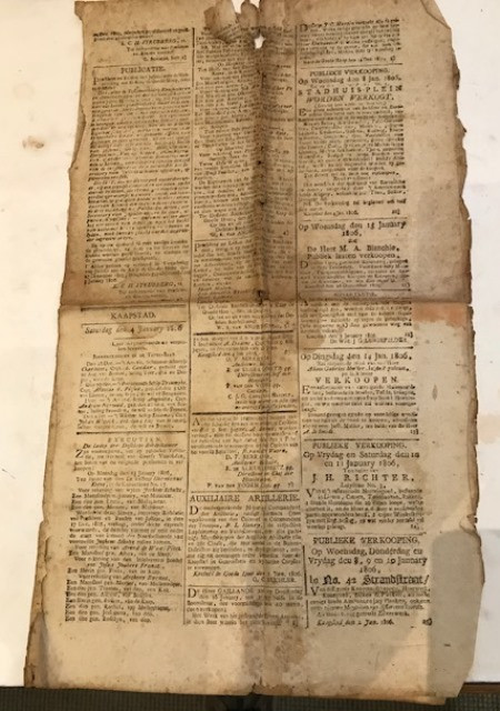 The rest of the Courant is devoted to local matters. Sales of slaves, land and goods are recorded, the winding up of estates (including that of Petrus Johannes Hiebner), the concert to be held on 6 January where the first item on the programme would be the 'Groete Simphonie van Mozart' arranged by J.C. Schrumpf (who would also play the lead violin), a person pleading for the return of his 'Zak-boekje' that was lost to him to 45 Bree Street, the sale of the house of Willem Koekke, 5 Peperstraat and even the sale of a book for 5 Rds. titled ORDANNANTIE, RAAKENENDE HET BUITEN-DISTRICHTEN, in de Nederlandsch Zuid-Africaansche Volkplanting aan de Kaap de Goede Hoop'.