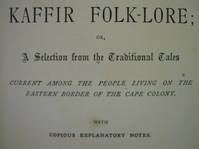 A good copy of this very scarce African story book, sub-titled \" A Selection from the Traditional Tales Current among the people living on the eastern border of the Cape Colony\", presumably the 1882 first edition, as it is housed in original brown boards (boards are marked, with gilt spine titles,[second edition had a green cover]), and containing a contemporary pencil note on upper front free which states \"Publshd. 1 March 1882\", with initials I.W.C. underneath (book seller?). Owner bookplate affixed to front paste-down (Louis Clifford Thompson). Blind stamped ruling to front and back covers, gilt spine titles, decorated brown end-papers in good condition \'flower and leaf\' pattern, contents good throughout, tight binding, decorative head-pieces and initial letters, 212pp. total, 23 chapters, including 18p. \"NOTES\".