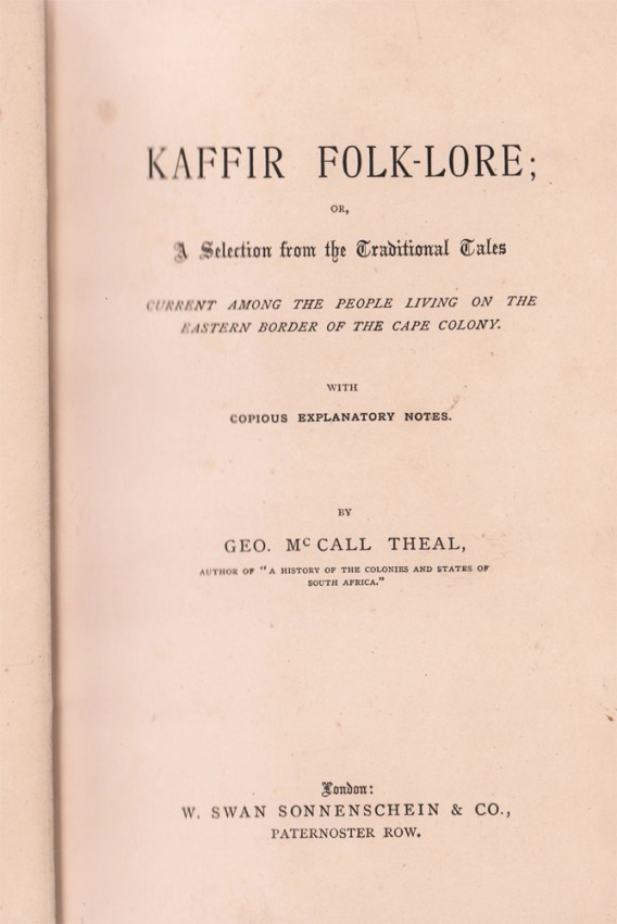 Mendelssohn (Sidney)South African Bibliography vol 2 page 475: The particulars for this work were collected by the author during twenty years' interaction with the Kaffir people in a variety of capacities, ranging from a mission teacher to a border magistrate. Most of the tales have, it is stated, already appeared in South African papers and magazines, and show considerable imaginative faculties on the part of the natives, while affording much information with regard to their religion, customs, and government.