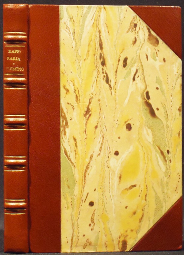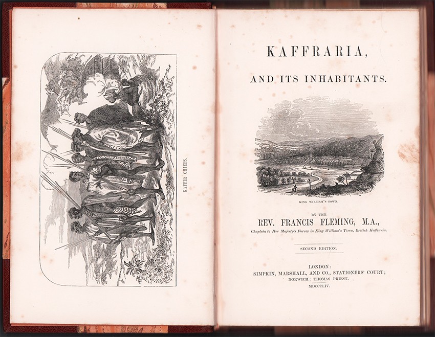 Mendelssohn (Sydney) South African Bibliography, volume 1, page 551, ‘The Preface to the first edition states that the author had resided for nearly three years in Kaffraria, and in the second edition there is a supplementary chapter bringing the book up to date. The volume commences with a short history of the Cape Colony and its surroundings, with copious notes upon the Hottentots and Bushmen. There is also an introductory description of Kaffraria and the Kaffirs, with an account of the treaties entered into between the latter and the British, by Sir B. D'Urban, Sir A. Stockenstrom, and others, before the final annexation of the country by Sir Harry Smith. At the time the book was issued a rebellion had broken out, the natives being led by Sandilli and Makoma. The information afforded concerning the zoology, botany, scenery, and climate of the country is very ample, and the author stated that “Kaffraria may safely be affirmed to be one of the healthiest parts of the known world.” There is also an exhaustive description of the personal appearance, language, customs, and origin of the natives, who are described as “fine, noble, manly fellows, as bold as lions and as daring as eagles.”’ Fleming was Chaplain to the British forces in King William’s Town.