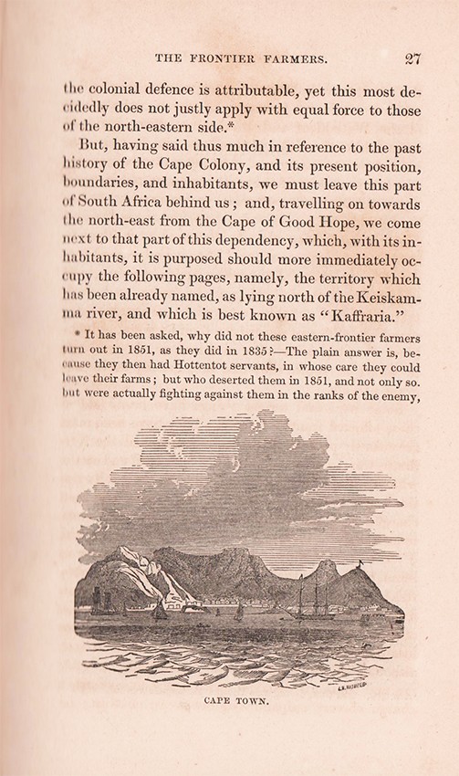 Second edition: 155 pages, wood engraved frontispiece, title page vignette, folding map coloured in outline, 8 engraved plates, 1 text illustration (a view of Table Bay), recent half brown morocco with marbled paper sides, a very good copy.