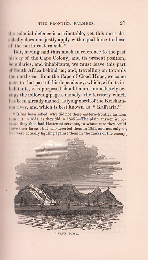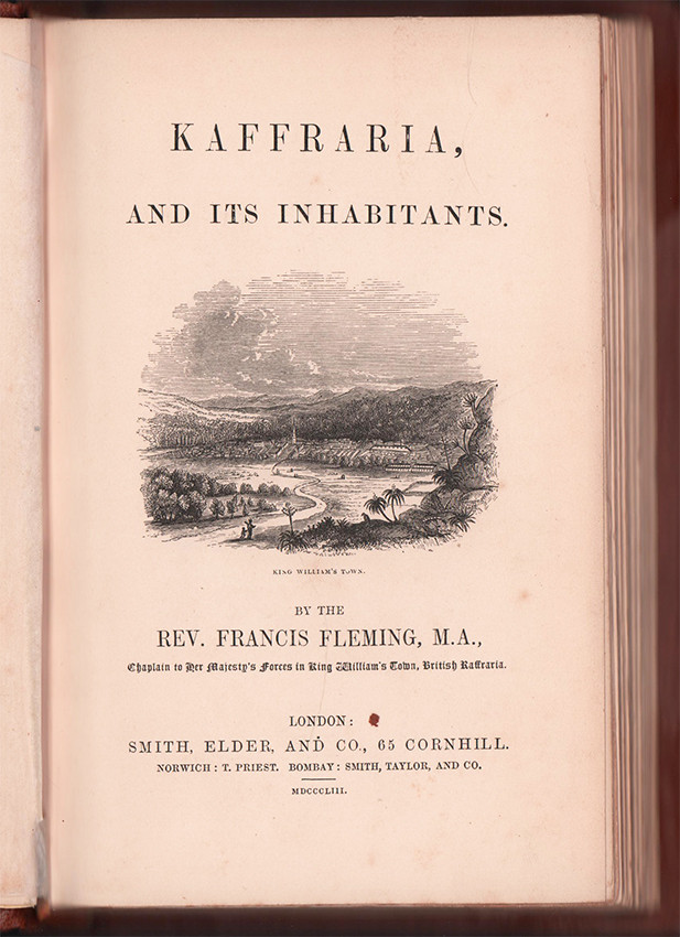Mendelssohn (Sidney) South African Bibliography, volume 1, page 551:Fleming was Chaplain to the British forces in King Wiliam's Town. His book also contains extensive descriptions of the '....personal appearance, language, customs, and the origin of the natives who are described as "fine, noble, manly fellows, as bold as lions and as daring as eagles,"'