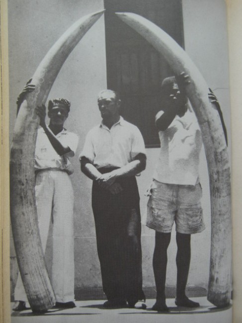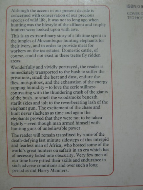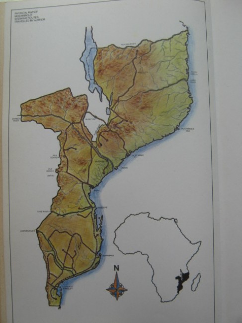 The book describes the author’s almost half-century as a hunter in Mozambique. A colour map of his routes is on both free endpapers. In pencil above the front map in this copy are “sample” and “R6.95”.