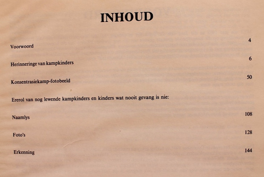 Contains short reminiscences of camp life during the Anglo-Boer War as seen through the eyes the children as well as photographs of daily life in the camps. Contains a roll of honour of camp children who were still alive at the time of publication (1982) as well as those who were never caught and taken to camps.