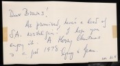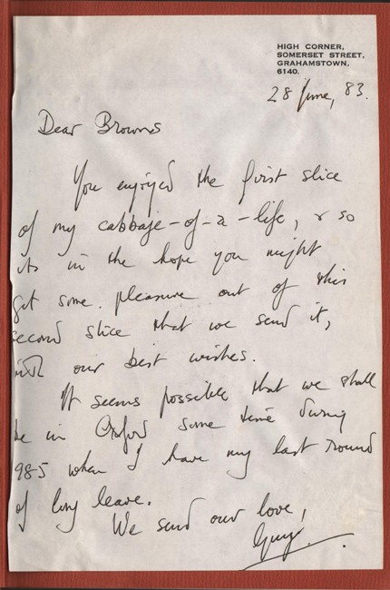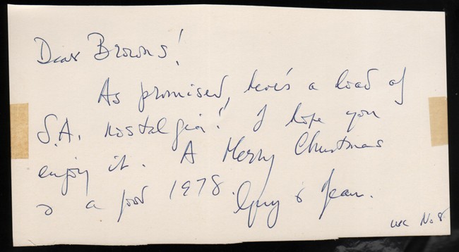 KAROO MORNING, 1918-35, 267 pages, illustrations, brick red simulated cloth, dust jacket worn at the edges. Signed on the title page and with a note reading, ‘Dear Browns! As promised here’s a load of SA nostalgia. I hope you enjoy it. A Merry Christmas and a good 1978. Guy & Jean.’