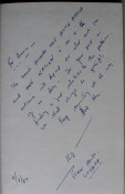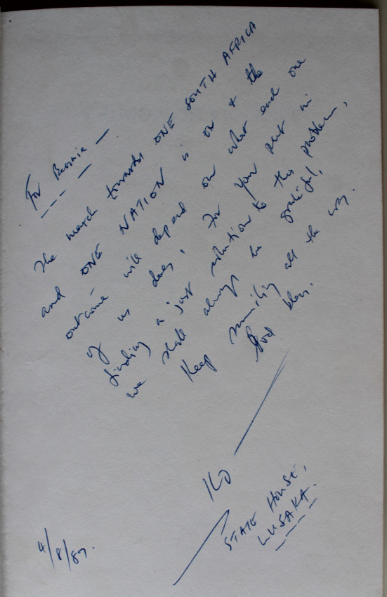 The inscription reads: For Bennie. We march forward ONE SOUTH AFRICA and ONE NATION is on + the outcome will depend on where....... Signed 4/8/1987, State House, Lusaka.