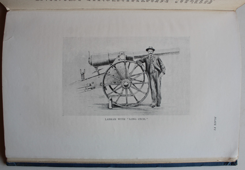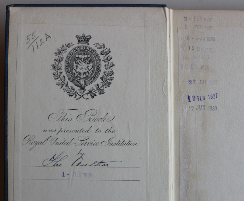 150 pages, frontispiece portrait, folding map, 8 plates, original blue cloth back, gilt on spine. A bookplate on paste down indicates that: This book was presented to the Royal United Service Institution by The Author. Dated 1 February 1926. Followed on ffep by some more loan library dates. In good condition.