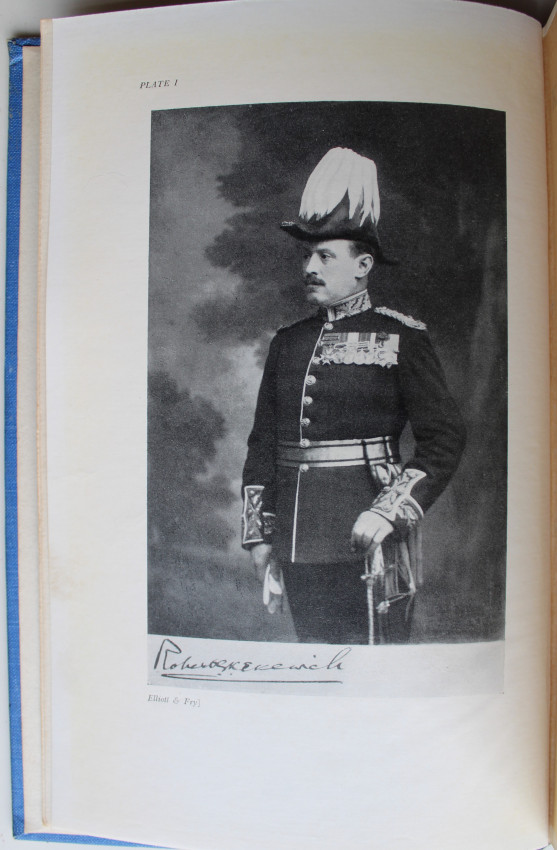150 pages, frontispiece portrait, folding map, 8 plates, original blue cloth back, gilt on spine. A bookplate on paste down indicates that: This book was presented to the Royal United Service Institution by The Author. Dated 1 February 1926. Followed on ffep by some more loan library dates. In good condition.