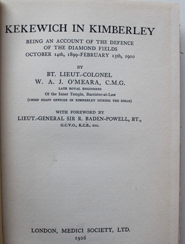 Being an Account of the Defence of the Diamond Fields, October 14th, 1899 - February 15th, 1900 with a foreword by Lieut-General Sir R Baden-Powell.