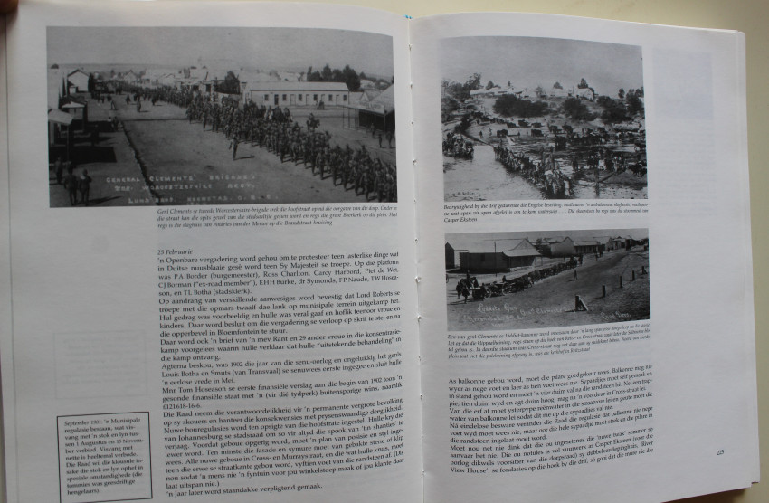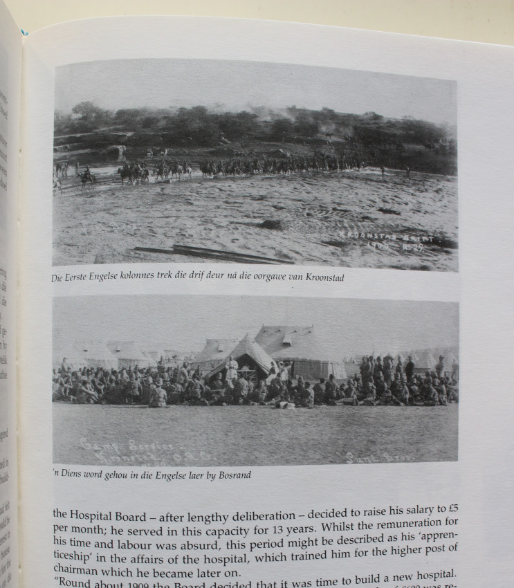 14pp (unnumbered) plus 646 pages. Mostly written in Afrikaans but also includes many English references/paragraphs. A large heavy book of 4 kilograms plus. A chronicle about the origin, growth and future prospects of a Free State 'Plattelandse Dorp'. Includes a large chapter on the Boer War, more than 85 pages with more than 40 black and white pictures of the ABW.