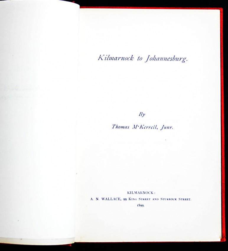 A scarce title of early travel to South Africa and the Gold Fields. SABIB 5,206. Only 1 Copy. Small 128pp. volume bound in red cloth lettered in gilt. Recounts the author's sea voyage to Cape Town in the Scot in 1898. The main description is of life on the Witwatersrand where he eventually found employment on the mines, with interesting observations on the black tribes, their war dances etc.