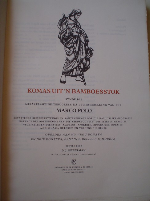 Komas uit 'n Bamboesstok, synde die mirakelagtige terugkeer na lewensversaking van ene Marco Polo. Bevattende reisbeskrywings en aantekeninge oor die natuurlike geografie rakende die ooreenkoms van die aardkloot met die sfere mineralies, vegetaties en dieraties, amoreus, apokrief, biographies, boertig, medisinaal, retories en volgens die beurs.