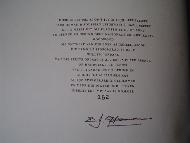 Van die eerste oplaag is 250 eksemplare gedruk op handgeskepte papier van T H Saunders en gebind in Scholco-Halflinnen KGZ. Al 250 eksemplare is genommer en deur die digter geteken. Hierdie eksemplaar is nommer 182.