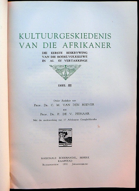 453pp + 465pp + 534pp. Original green cloth with bright gilt decorated spines, black titles to front covers. Decorated EP's. Richly illustrated in b/w throughout. True first editions. Includes a loose 4pp 'apartheid era' insert(see last two photos).